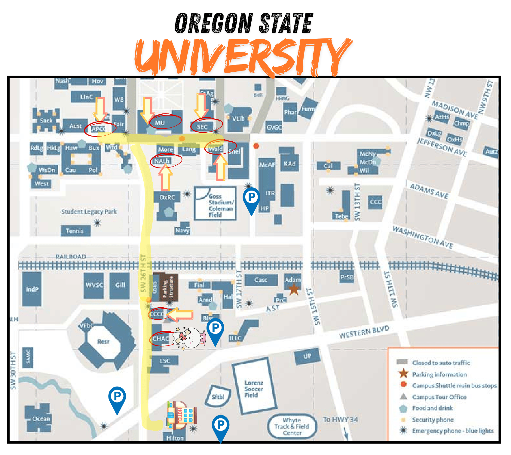 Our conference this year will be held at Oregon State University: 1500 SW Jefferson Way, Corvallis, OR, 97331. Conference spaces are below and also the red circles on the map: